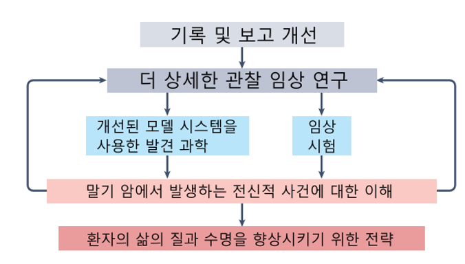 그림 2. 암 사망 원인에 대한 이해를 개선하기 위한 권장 사항. 이 도식은 말기 암의 기저 생물학에 대한 이해를 향상시키고 환자의 삶의 질을 개선하기 위한 전략을 제공하기 위해 권장 사항들이 어떻게 상호 연결될 수 있는지를 보여줍니다.